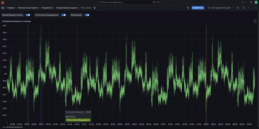 Объединение данных оперативного журнала с технологическими данными позволяет на одном экране отображать текущий режим (например, по суммарной активной мощности станции) с событиями, записанными в оперативном журнале. В зависимости от категории события в журнале, эти события отмечаются своими цветами, а также могут быть отключены (переключателем в верхней левой части) для быстрого анализа прошедшей смены или больших периодов времени.