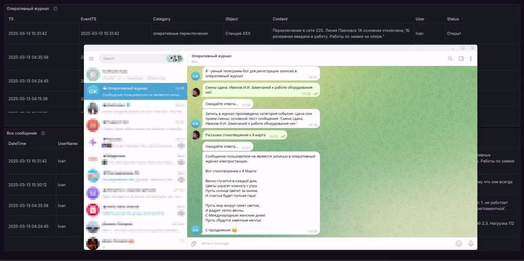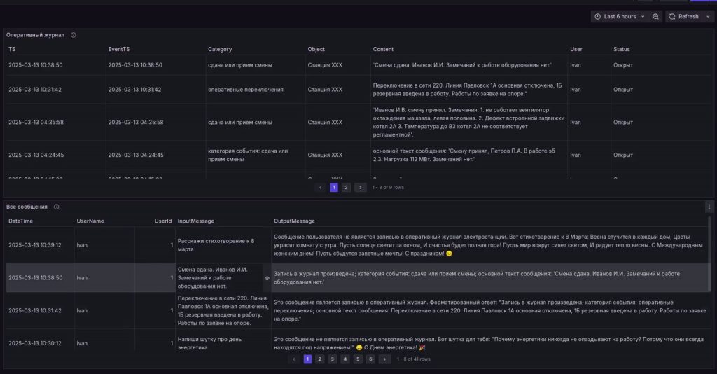 Большая языковая модель разбирает сообщение оперативного персонала, вычленяет основные моментыв каждой из категорий записи электронного журнала и сохраняет запись в строго формализованном виде.